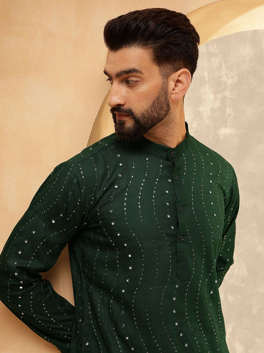 Men’s Green Sequin & Mirror Work Kurta Pyjama Set – Pure Cotton
