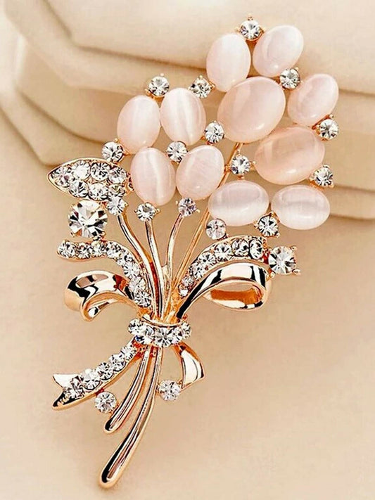 Gold-Toned Opal & White Stone Brooch – Elegant Wheat Flower Saree Pin
