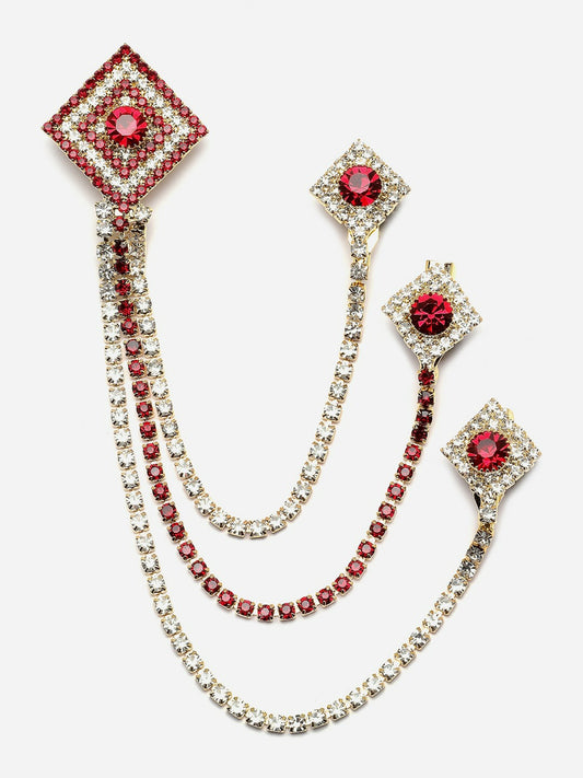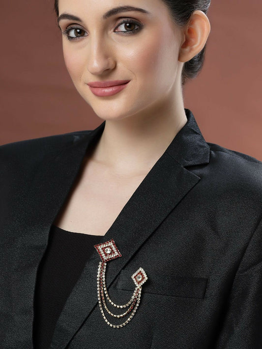 Unisex Gold-Toned & Maroon American Diamond Brooch Lapel Pin – Elegant Stone-Studded Accessory