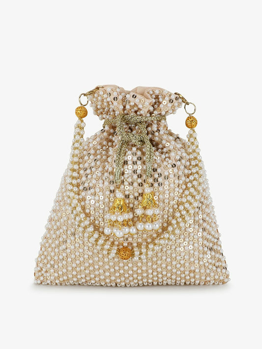 White & Gold Pearl Embellished Potli Clutch – Ethnic Handbag for Weddings & Festive Wear