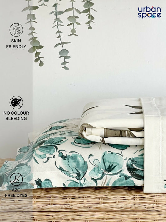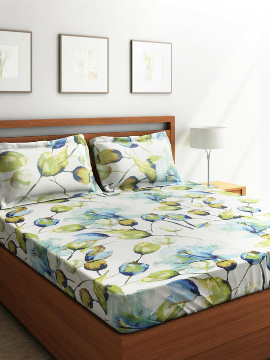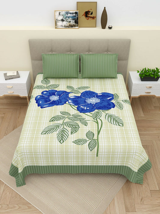 Super King Size Floral Bedsheet Set – 220 TC Cotton | Green & Blue | 2 Pillow Covers
