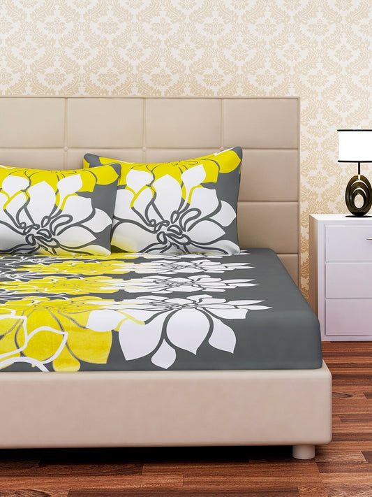 Grey, White & Yellow Floral King Size Bedsheet Set – 144 TC Cotton with 2 Pillow Covers