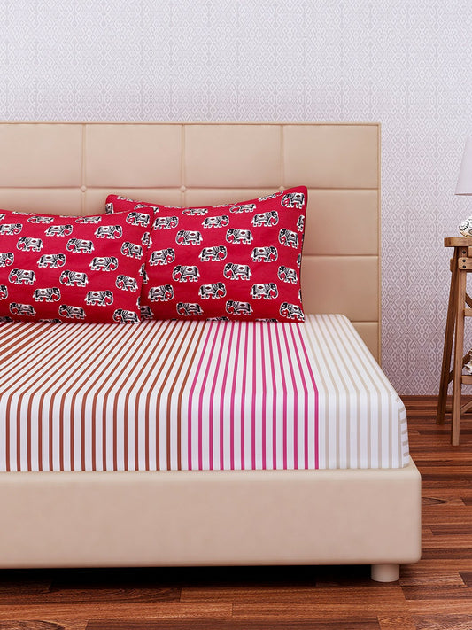Red & Brown Striped Double Bedsheet Set – Soft Cotton Blend with 2 Pillow Covers (144 TC)