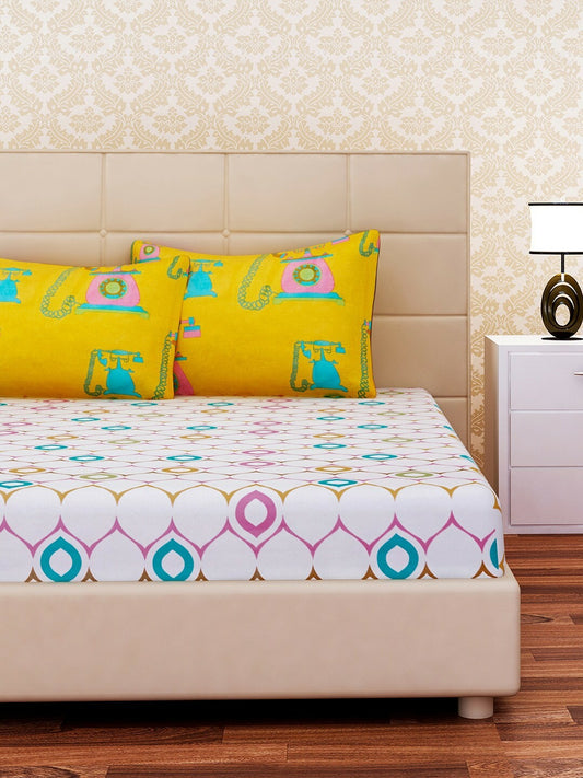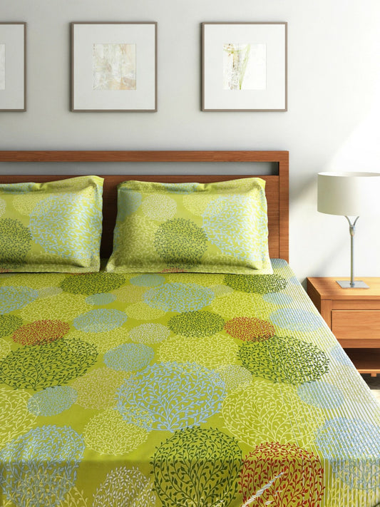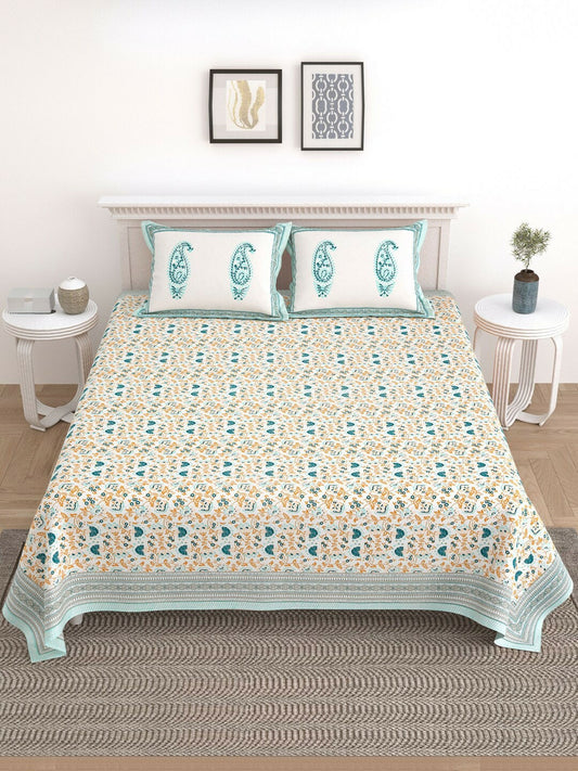 Premium Cotton Printed King-Size Bedsheet Set – 210 TC | Green, Orange & White | 1 Bedsheet + 2 Pillow Covers