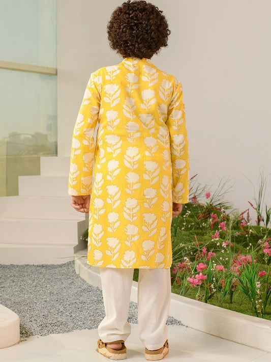 Boys Yellow & White Floral Printed Kurta with Pyjama – Pure Cotton Ethnic Wear for Festivals & Weddings