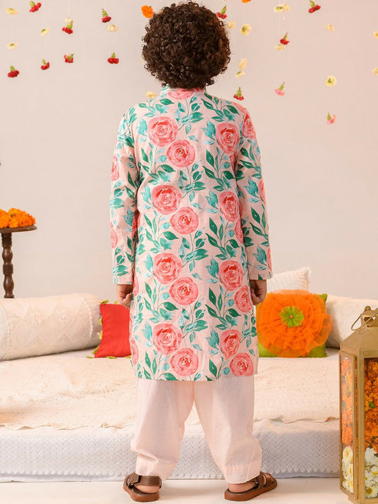 Boys Floral Printed Pure Cotton Kurta with Pyjamas – Ethnic Wear for Festivals & Weddings