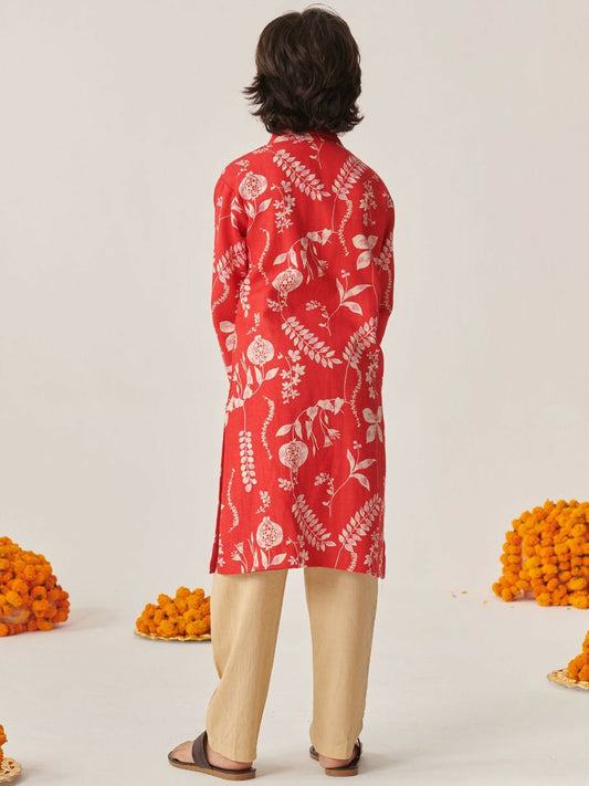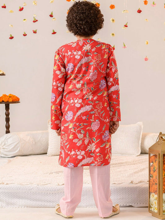 Red Printed Kurta with Pyjama for Boys – Pure Cotton Ethnic Wear for Festivals & Weddings
