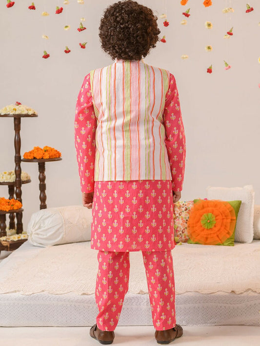 Pink Printed Kurta with Pyjamas & Nehru Jacket – Ethnic Wear for Boys | Pure Cotton