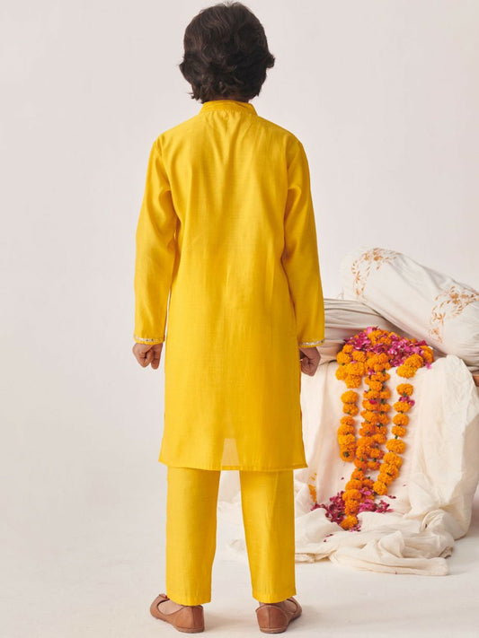 Boys Yellow Solid Kurta with Pyjama & Jacket – Silk Blend Ethnic Wear for Weddings & Festivals