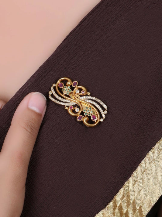 Gold-Plated Floral Stone Studded Brooch – Elegant Accessory for Ethnic & Formal Wear