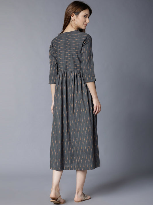 Grey Abstract Printed Fit & Flare Midi Dress – Ethnic Cotton Dress for Women