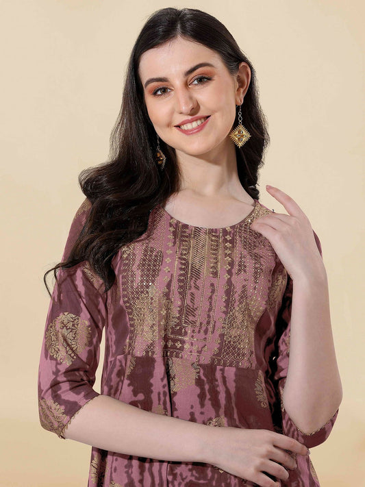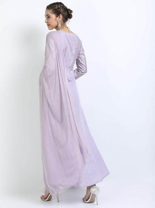 Mauve Ethnic Motifs A-Line Dress with Dupatta – Elegant Maxi Dress | Indiaista