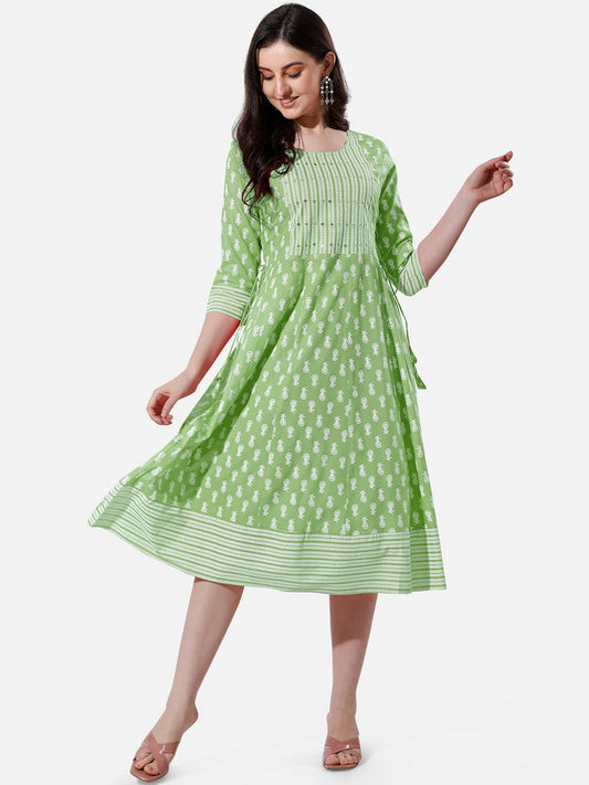 Sage Green Foil Printed Flared Ethnic Dress – Elegant Indian Outfit for Women