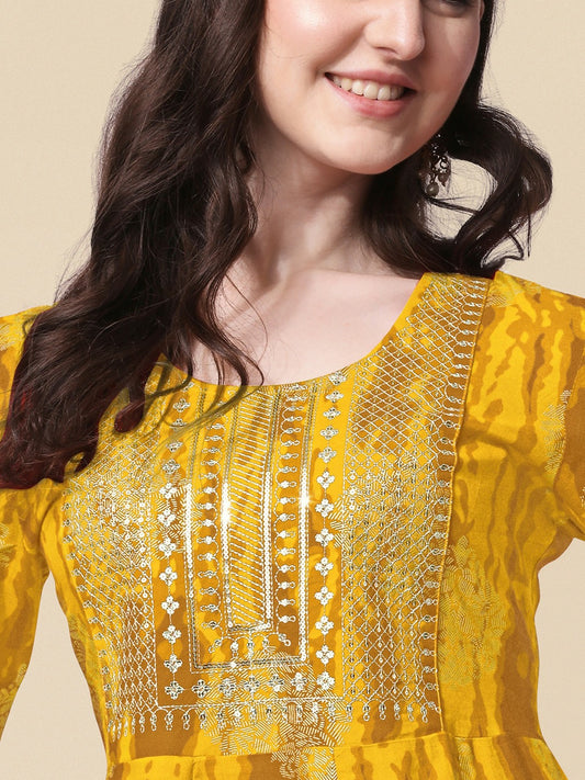 Green & Gold Floral Fit & Flare Ethnic Dress - Sequined | Indiaista