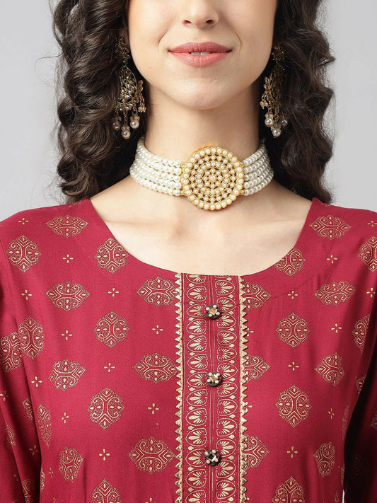 Maroon & White Ethnic Motif Printed A-Line Dress | Indiaista