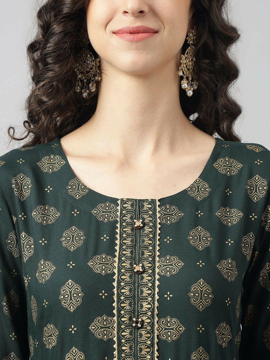 Green & Gold-Toned Ethnic Motif Printed Maxi Dress – A-Line Flared Ethnic Wear for Women