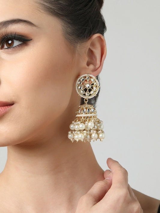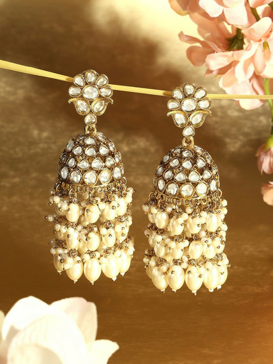 Gold Plated Pearl Studded Kundan Jhumkas Earrings