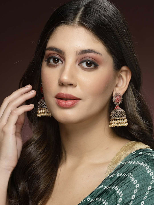 Women Gold-Plated Pearl Studded Jhumkas – Antique Dome-Shaped Earrings | Indiaista