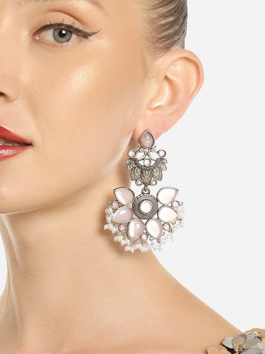 Women Gold-Plated Oxidised Floral Drop Earrings – Elegant Pink Stone Jewelry