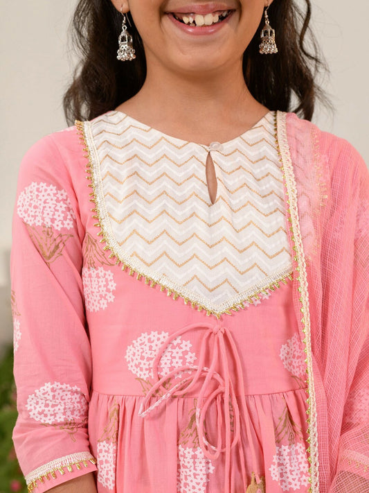 Buy Girls Pink Printed Cotton Kurta Set with Palazzos & Dupatta – Indiaista