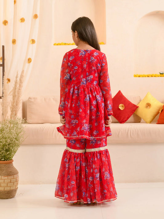 Buy Girls' Floral Printed Kurta & Sharara Set with Dupatta - Red | Indiaista