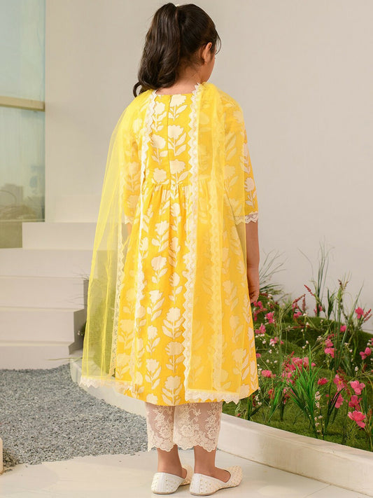 Buy Yellow Floral Printed Girls Kurta Set with Trousers & Dupatta - Pure Cotton | Indiaista