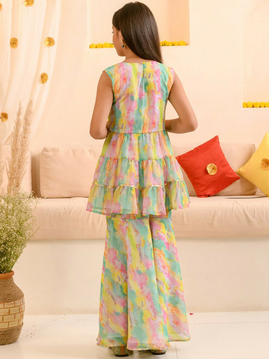 Girls Yellow Floral Printed Cotton Kurti with Sharara & Dupatta - Indiaista