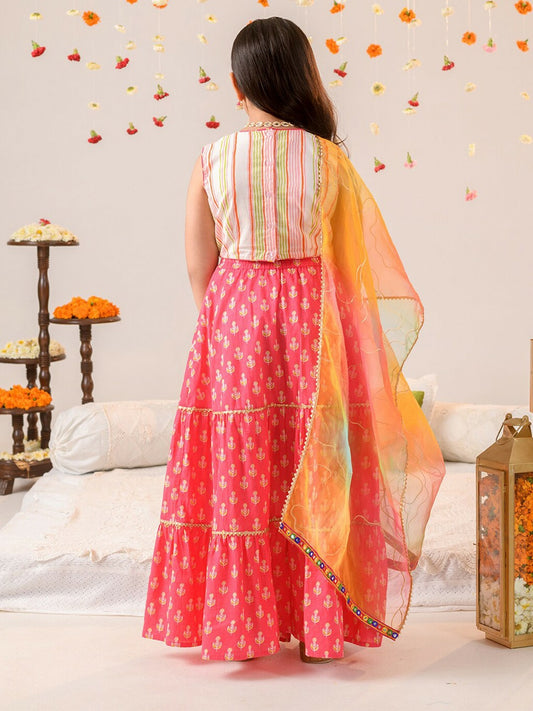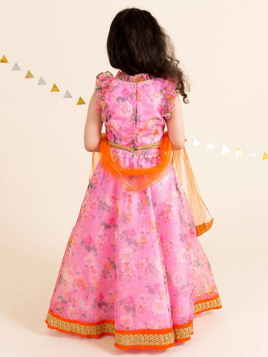 Buy Girls Pink & Orange Printed Lehenga Choli with Dupatta | Indiaista