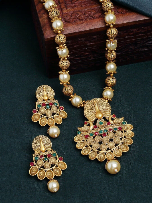 Gold-Plated Beaded Temple Jewellery Set with Peacock Pendant & Earrings