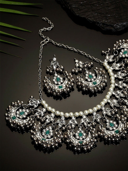 Oxidised Silver-Toned Kundan & Beaded Jewellery Set | Indiaista