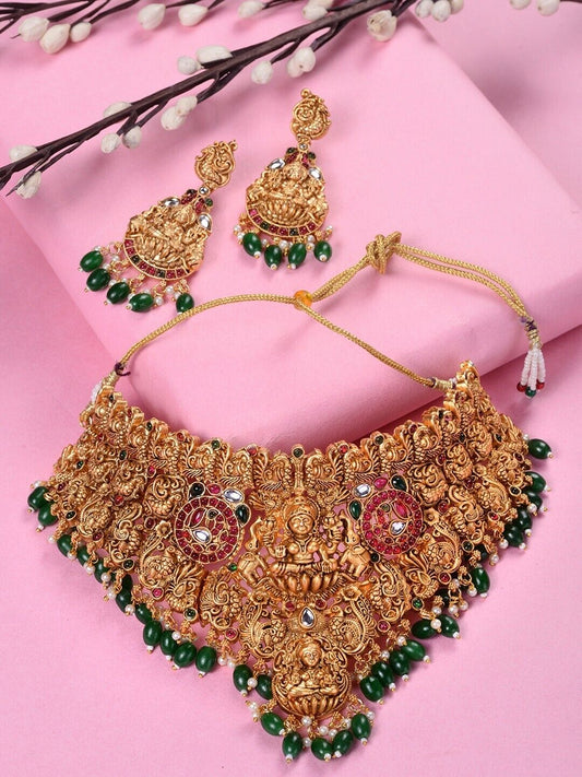 Indian Wedding Bridal Bollywood Jewelry Set - Gold-Plated Beaded Temple Necklace & Earrings