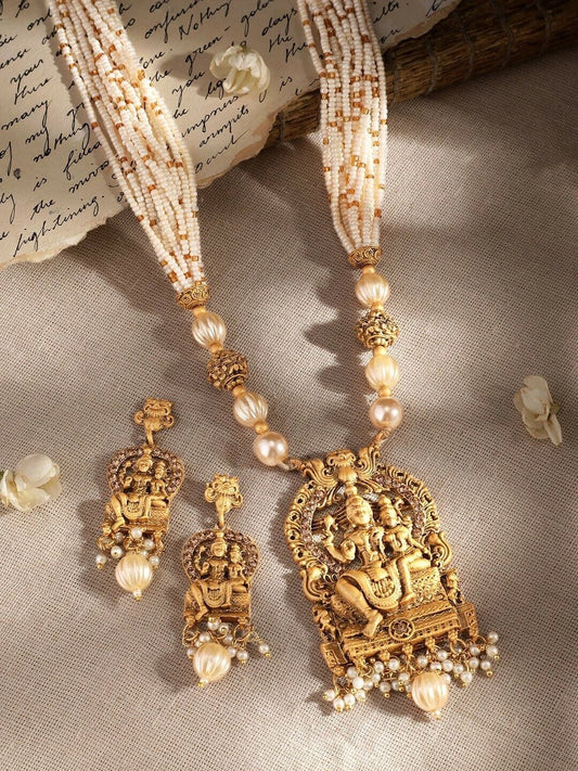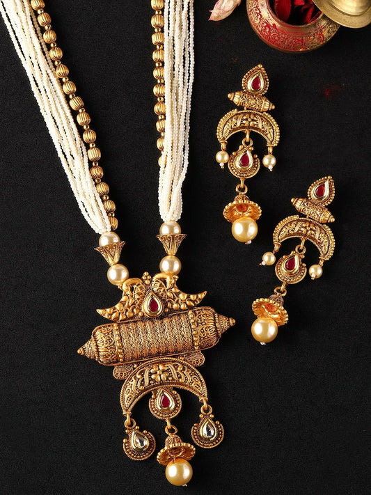 Women’s 18K Gold-Plated Temple Jewellery Set with Red & White Stones & Pearl Beads – Indiaista