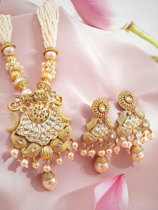 Gold Plated Kundan Studded Necklace & Earring Set with Layered Beads