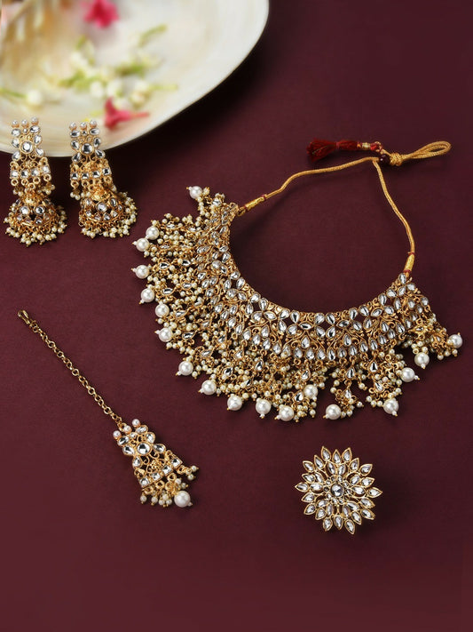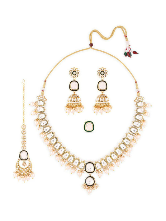 Women’s Gold-Plated Kundan Jewellery Set | Necklace, Earrings, Maang Tikka & Ring – Indiaista