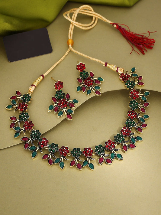 Gold Plated Maroon & Green American Diamond Choker Necklace Set with Earrings