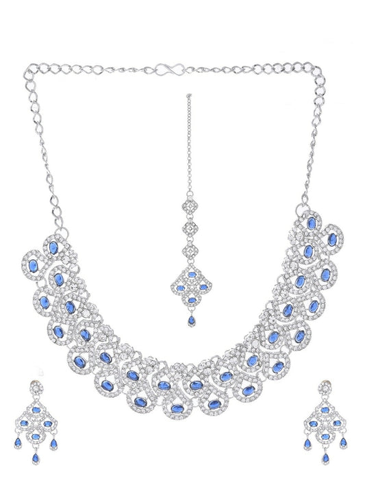 Silver-Plated Blue AD-Studded Elegant Necklace, Earrings & Maangtikka Set