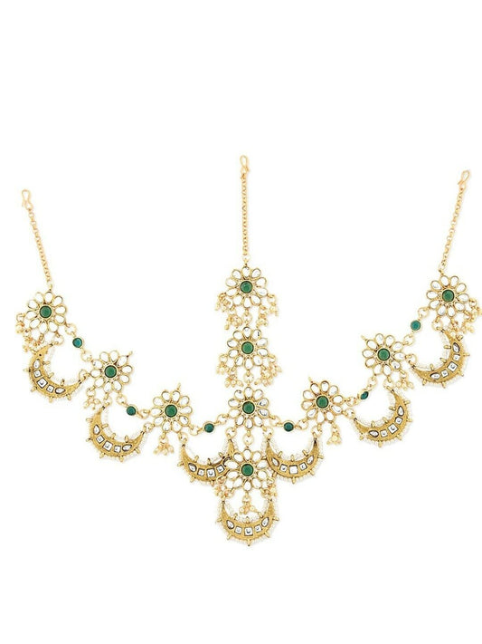 Gold-Plated Kundan Matha Patti for Women – Green & White Stone-Studded Maang Tikka | Indiaista