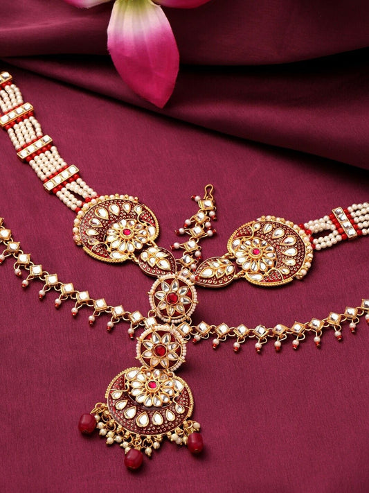 Gold-Plated Matha Patti for Brides – Maroon Kundan Sheeshphool with Beaded Detail | Indiaista