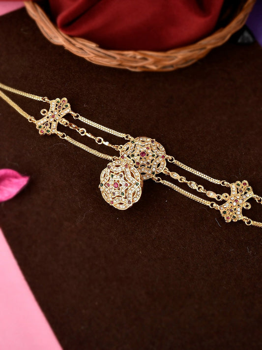 Gold-Plated Kundan & CZ Matha Patti – Handcrafted Maang Tikka with Pearl Beads | Indiaista