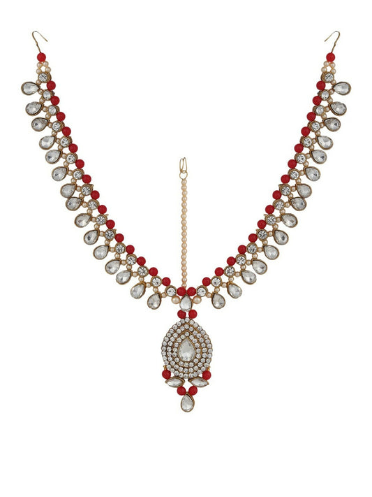 Gold-Plated Matha Patti for Women – Handcrafted, White & Red Stone Beaded Bridal Headpiece | Indiaista
