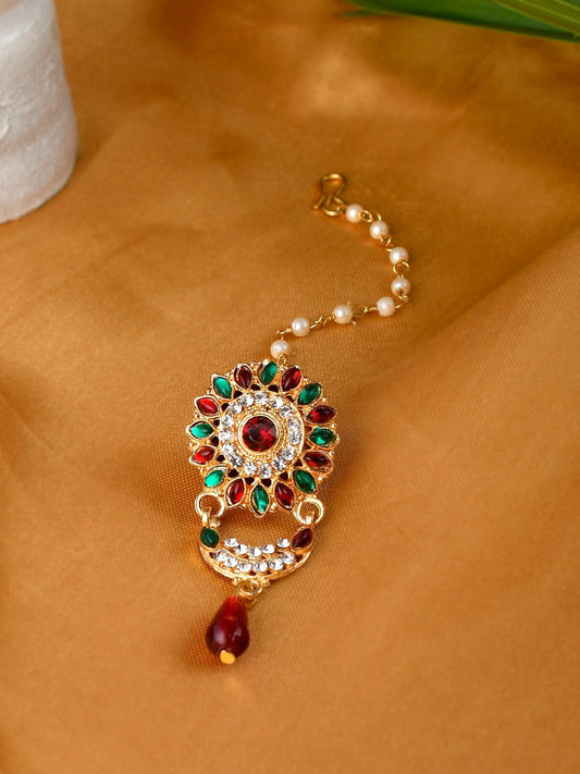 Red & Green Gold-Plated Matha Patti – Stone-Studded & Pearl Beaded Maang Tikka | Indiaista