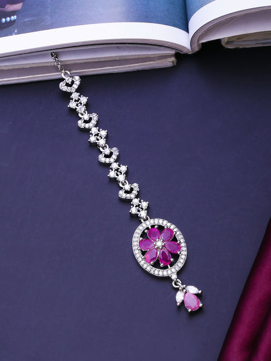 Silver-Plated Pink AD Studded Maang Tikka – Handcrafted Matha Patti for Women | Indiaista