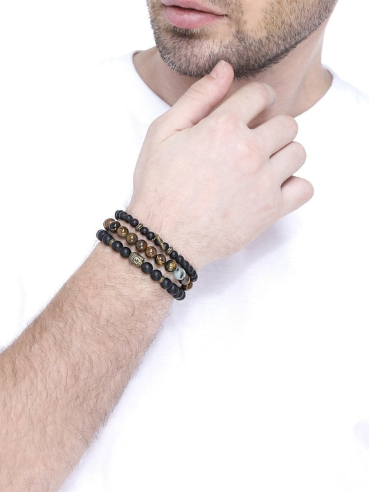Set of 3 Black & Brown Buddha Elasticated Bracelets for Men – Rhodium-Plated Gold-Toned Beads | Indiaista