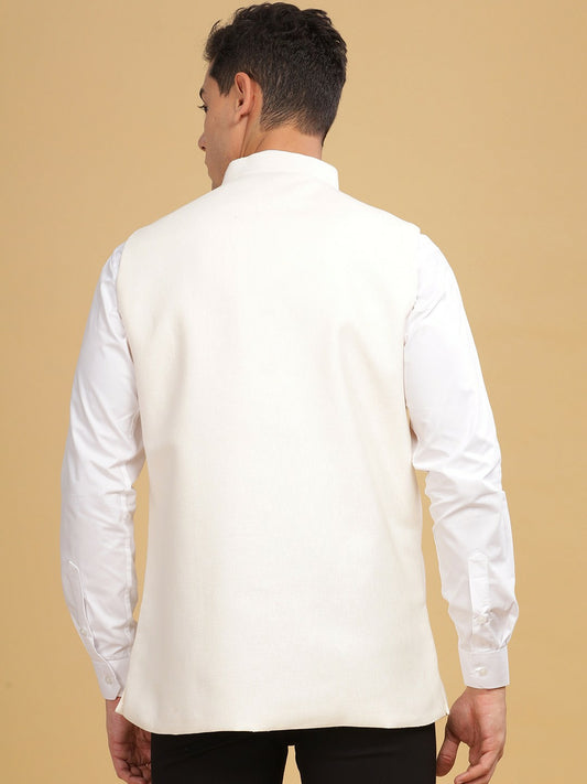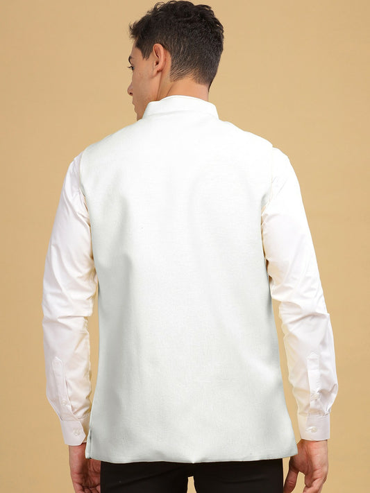 Men's White Solid Woven Nehru Jacket with Mandarin Collar & Sleeveless Design | Stylish & Elegant