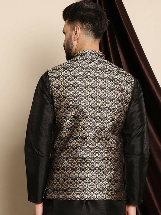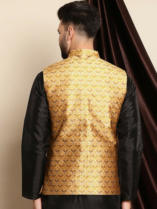 Black & Gold Woven Nehru Vest for Men – Festive Silk Blend Waistcoat