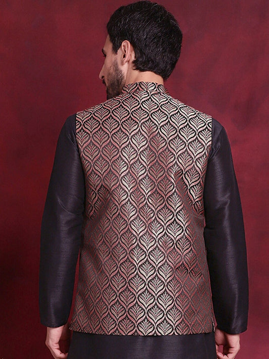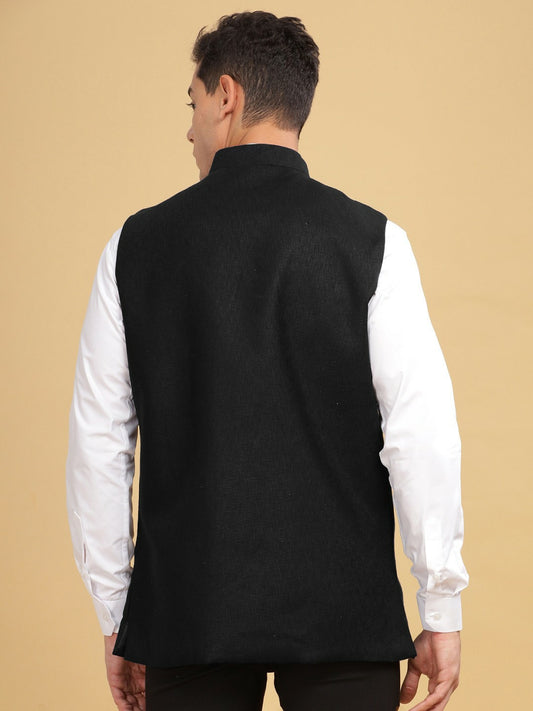 Men’s Black Woven Nehru Jacket – Classic Silk Blend Ethnic Vest