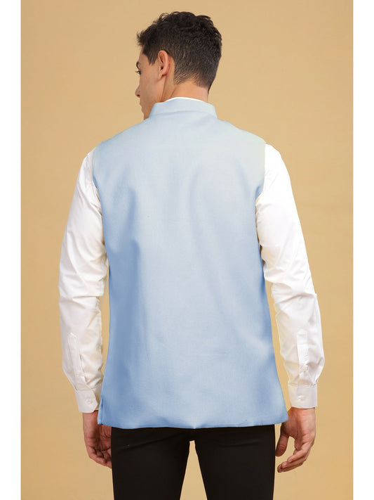Blue Woven-Design Nehru Jacket for Men | Mandarin Collar, Sleeveless, 2 Pockets