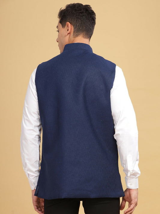 Buy Navy Blue Self-Design Solid Woven Nehru Jacket for Men – Stylish & Elegant | Indiaista