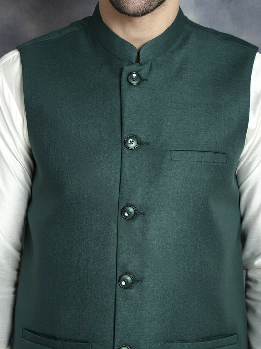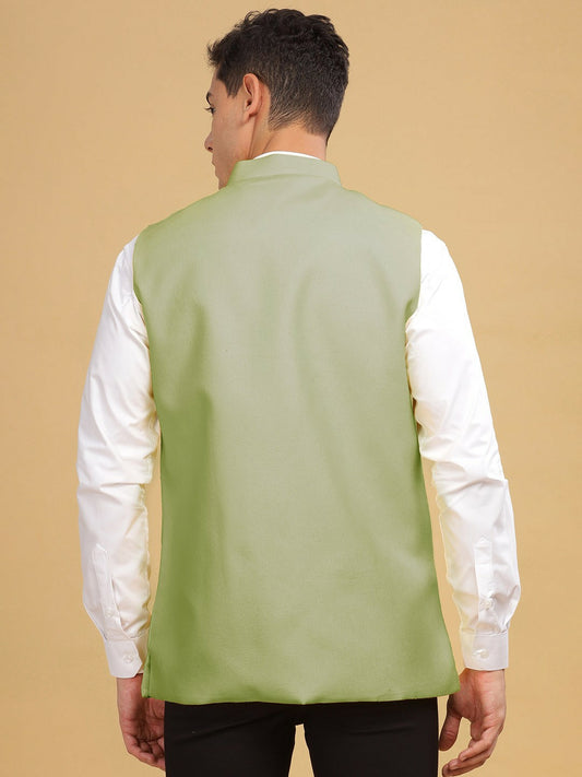 Men's Green Solid Woven Nehru Jacket with Mandarin Collar & Sleeveless Design