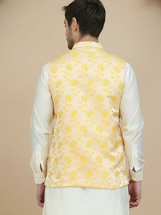 Yellow Embroidered Woven Satin Nehru Jacket for Men | indiaista